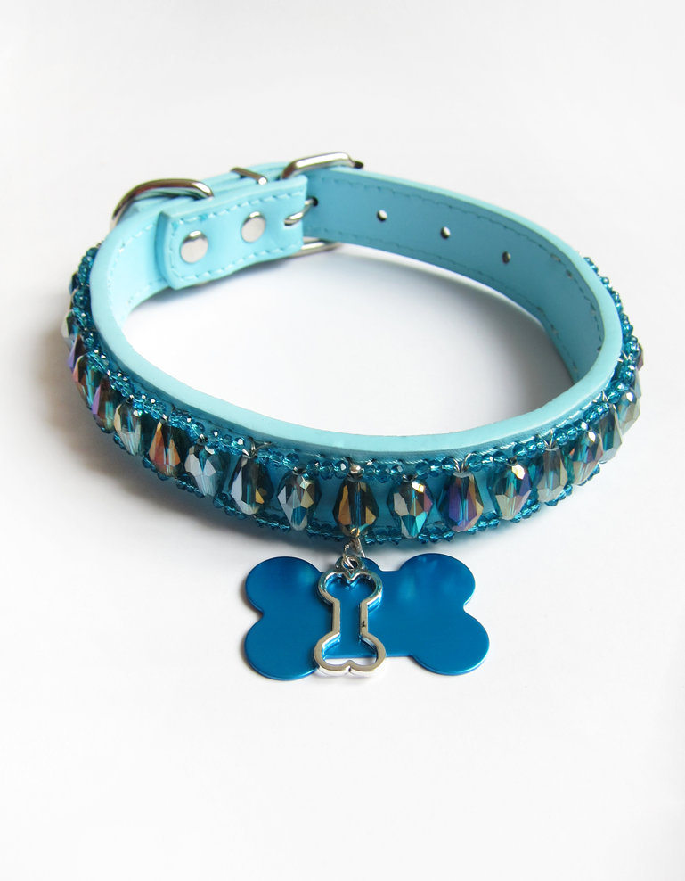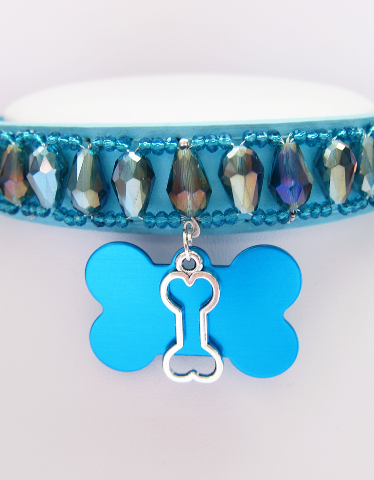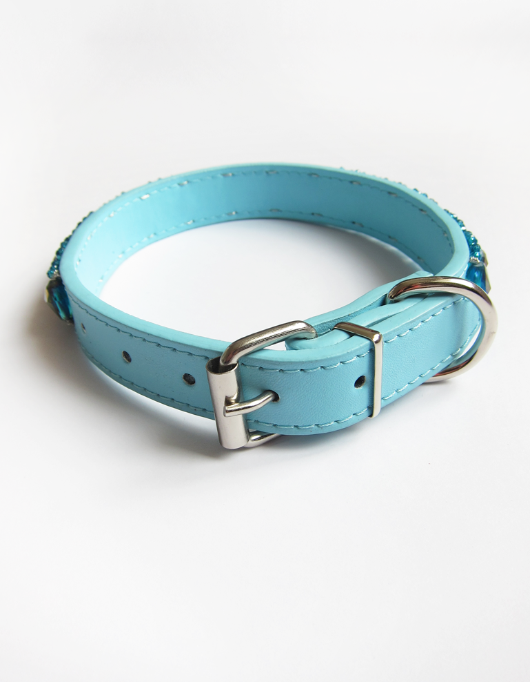 - Couleur : Simili cuir bleu ciel / Cristaux bleu à reflets