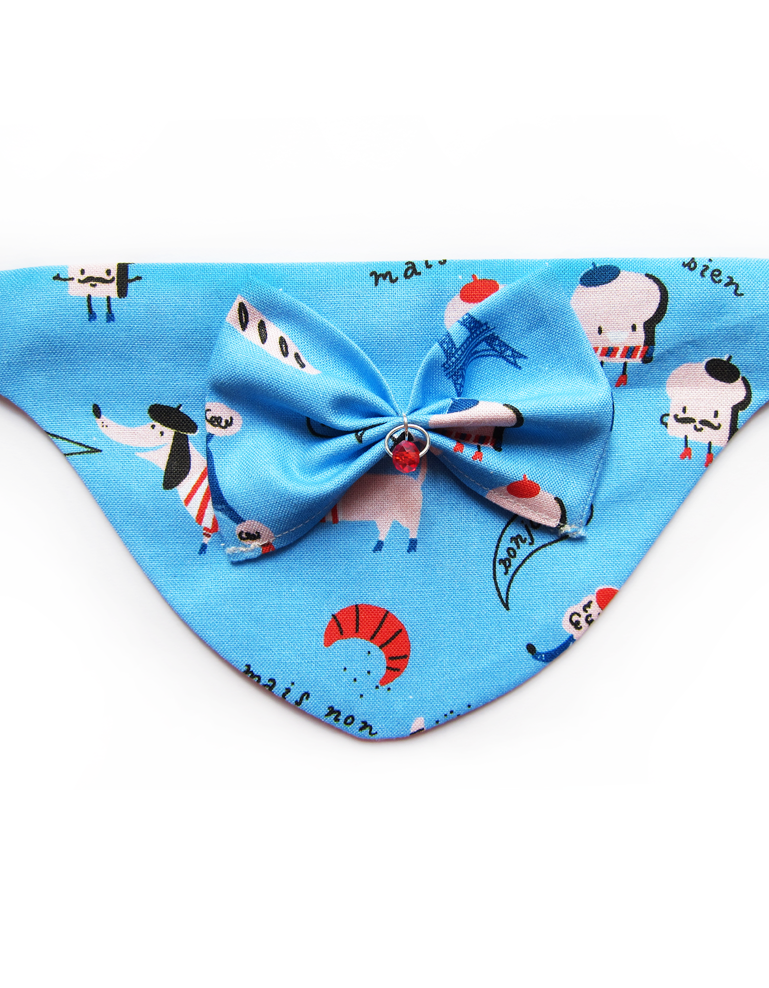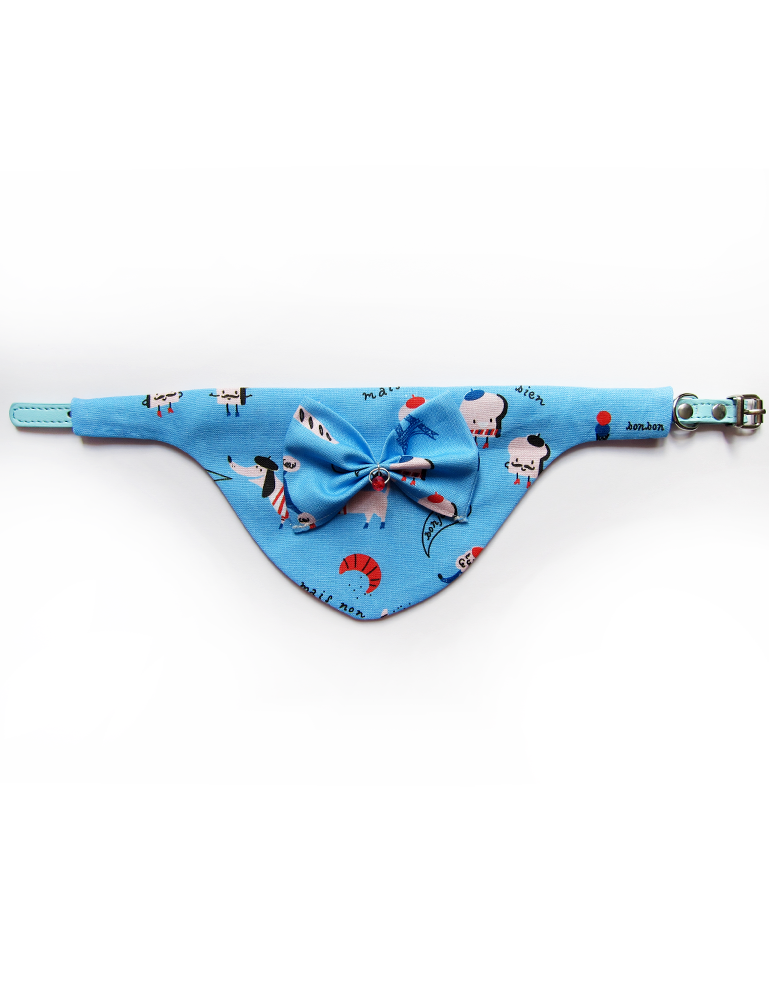 Foulard pour chiots et chats fait main en coton 100%, avec collier amovible, nœud en relief et solitaire en cristal. Design chiens clichés français sur fond bleu, chic et confortable pour un style unique.