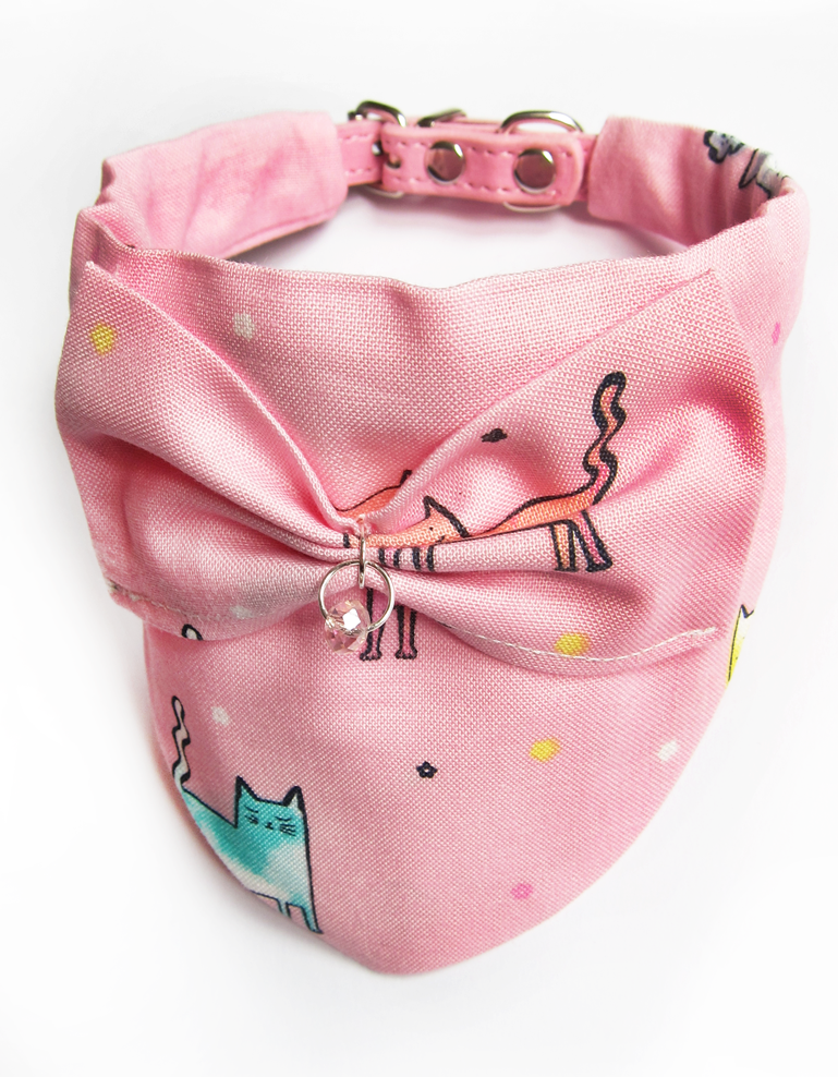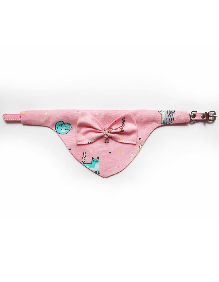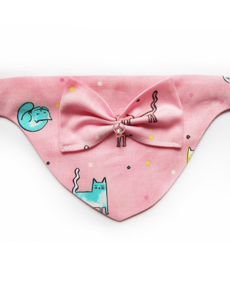 Foulard pour chiots et chats fait main en coton 100%, avec collier amovible, nœud en relief et solitaire en cristal. Design chats sur fond rose, chic et confortable pour un style unique.