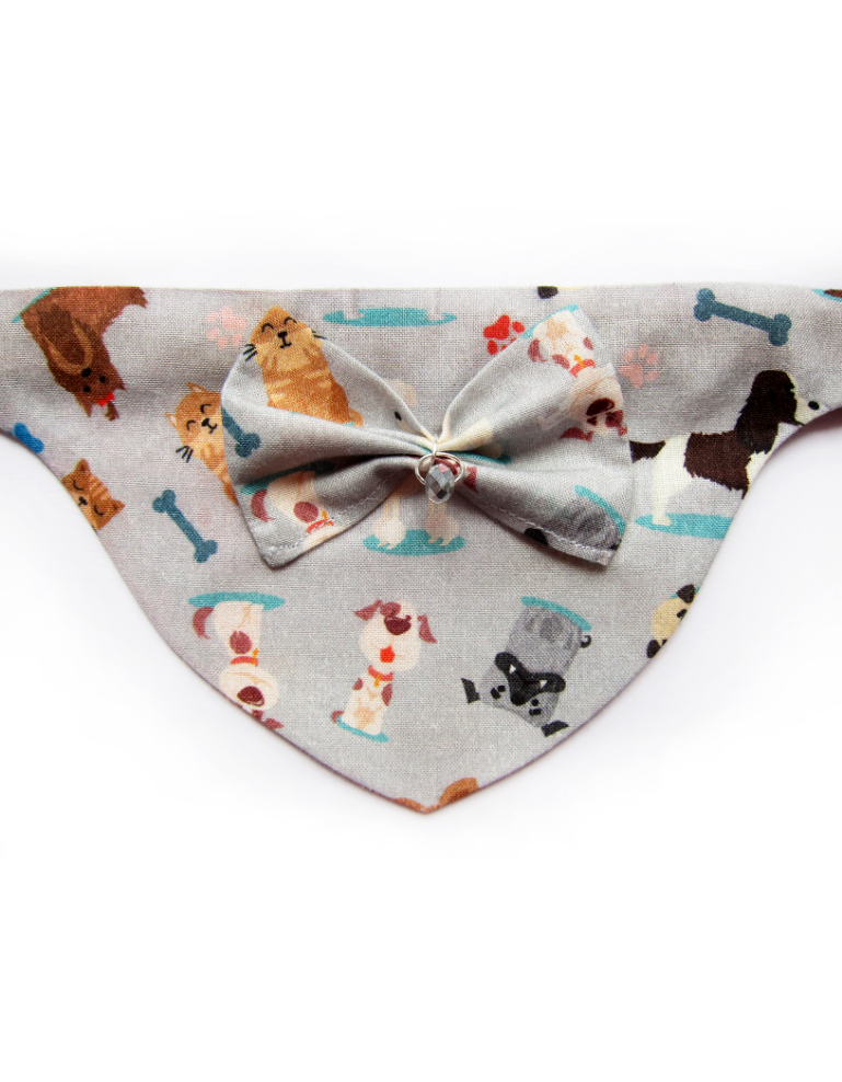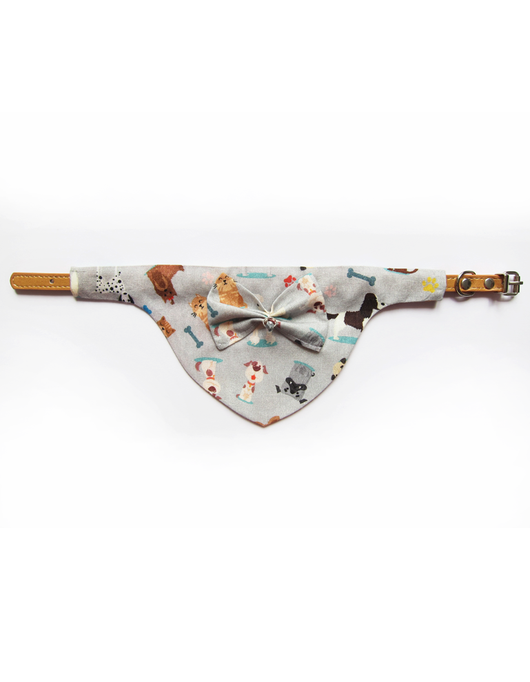 Foulard pour chiots et chats fait main en coton 100%, avec collier amovible, nœud en relief et solitaire en cristal. Design chiens sur fond gris, chic et confortable pour un style unique.