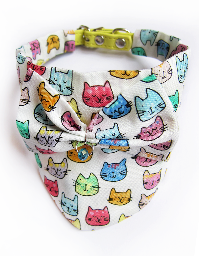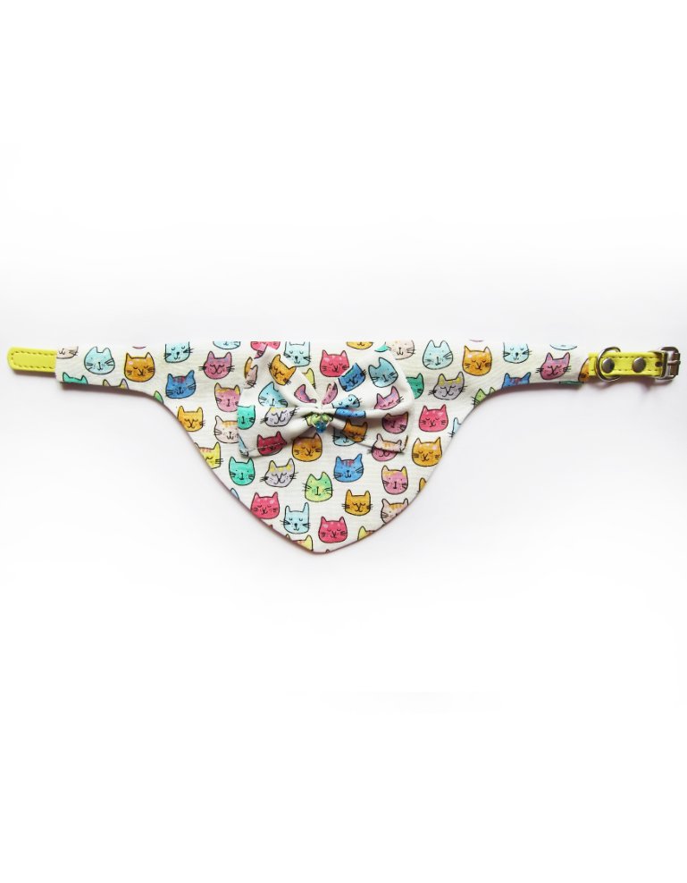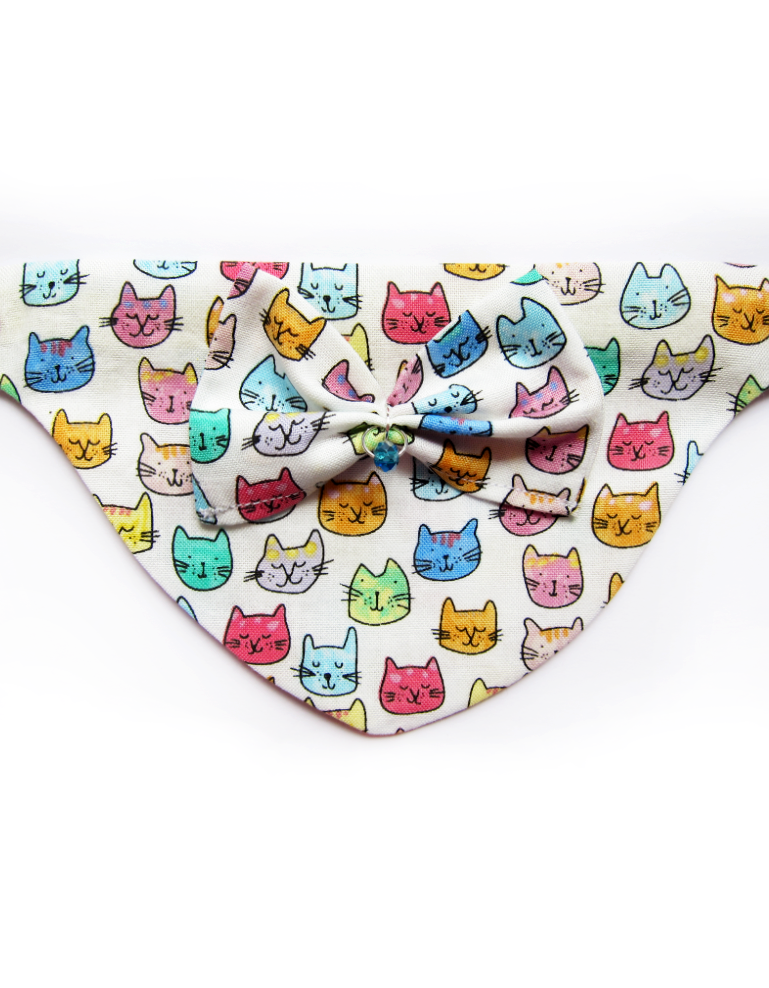 Foulard pour chiots et chats fait main en coton 100%, avec collier amovible, nƓud en relief et solitaire en cristal. Design aux tĂȘtes de chats multicolores, chic et confortable pour un style unique.
