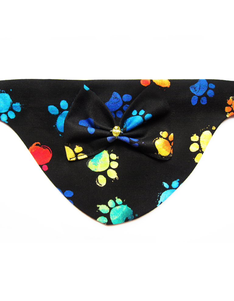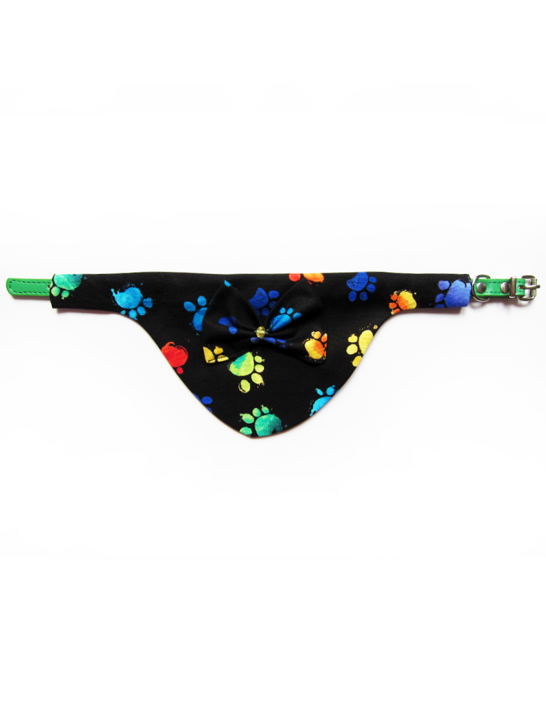 Foulard pour chiots et chats fait main en coton 100%, avec collier amovible, nœud en relief et solitaire en cristal. Design pattes multicolores sur fond noir, chic et confortable pour un style unique.