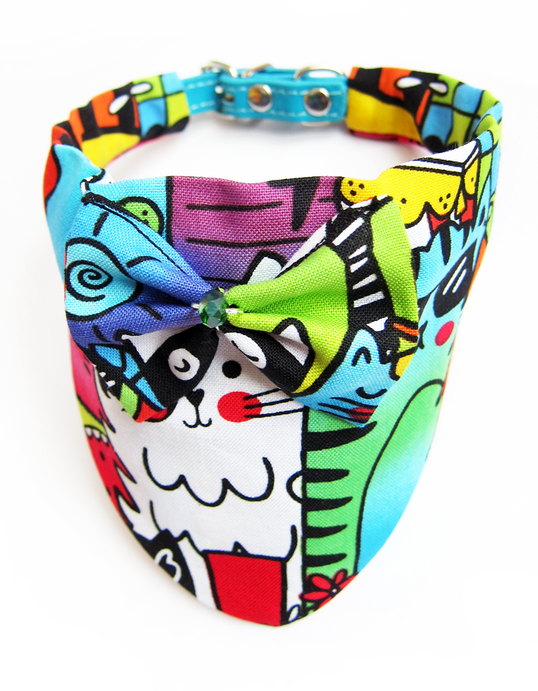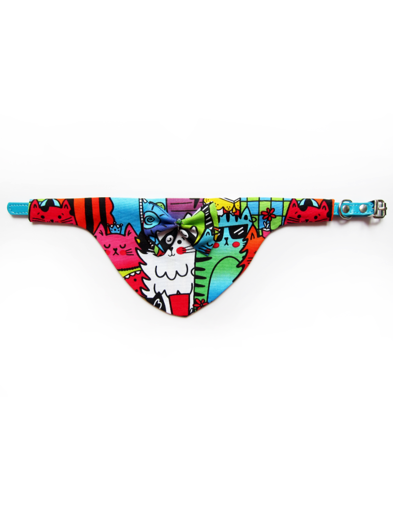 Foulard pour chiots et chats fait main en coton 100%, avec collier amovible, nœud en relief et solitaire en cristal. Design chats pop multicolores, chic et confortable pour un style unique.