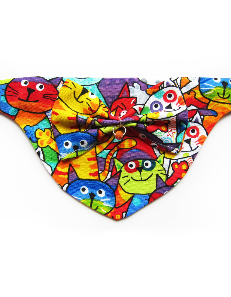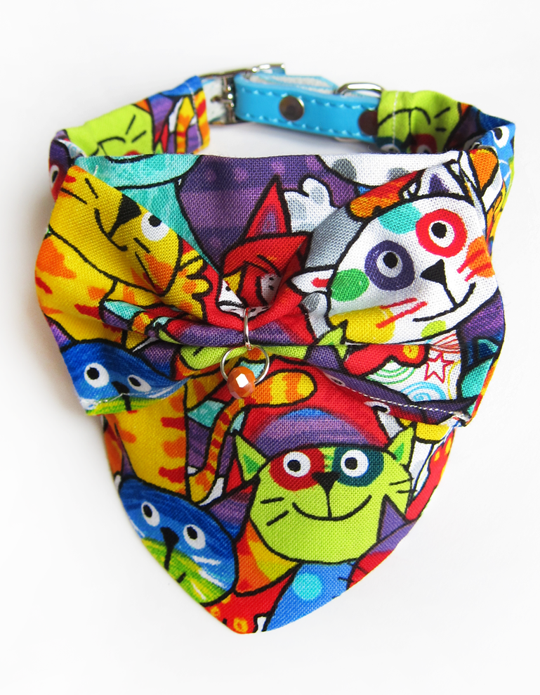 Foulard pour chiots et chats fait main en coton 100%, avec collier amovible, nœud en relief et solitaire en cristal. Design street art multicolores, chic et confortable pour un style unique.